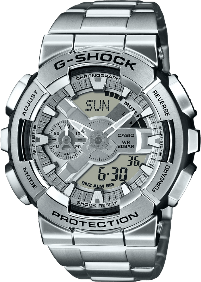 The G-Shock GM110D-8A is a bold fusion of industrial strength and refined style, crafted for those who demand both rugged durability and standout aesthetics. Featuring a robust metal bezel and a striking silver colour scheme, this watch delivers a premium feel with G-Shock’s renowned toughness.