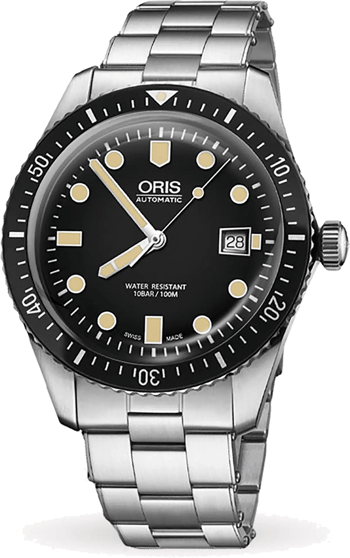 This new timepiece features a case made of sturdy stainless steel is able to withstand a water pressure of 10 bar. The dial of the watch is covered by scratch-resistant sapphire crystal that comes with anti-reflective coating on the inside. Luminous indices and hands guarantee best visibility at all times. Inside the case, a high-quality Oris automatic movement ensures accurate and precise timekeeping and impresses with a power reserve of 38 hours and functions like date window, instantaneous date, date corrector, fine timing device and stop-second. A flawless stainless steel bracelet provides wearing comfort and completes this stunning timepiece for men. The Oris Divers Sixty-Five - a perfect harmony of quality and style!