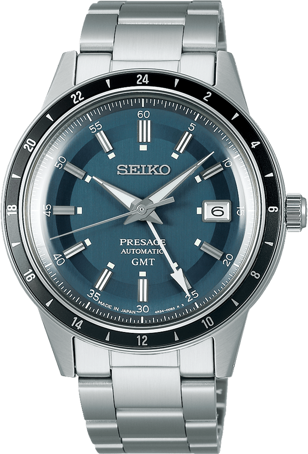 The Seiko Presage Petrol Blue style 60s Road Trip GMT Mens watch SSK009J is an automatic movement watch full in Stainless Steel with a Petrol Blue colour dial with a case size of 40.75mm, thickness of 13mm, a lug width of 20mm and a lug-to-lug size of 47mm.