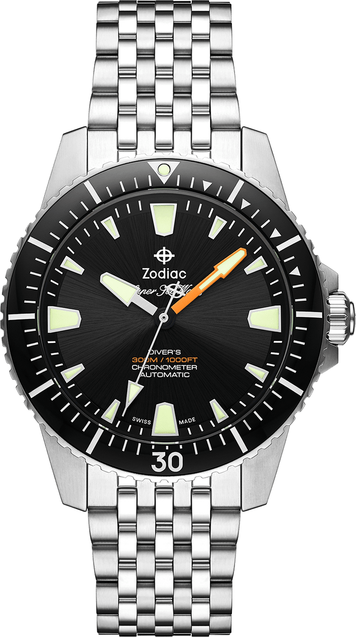 Featuring 300M of water resistance and ISO certification, the Super Sea Wolf Pro-Diver ZO3552 is professionally rated. Complemented by a brushed seven-link stainless steel butterfly-clasp bracelet, a black sunray dial with Super-LumiNova hands and markers and fully graduated black bezel, the Super Sea Wolf Pro-Diver ZO3552 is COS-C certified and a testament to Zodiac’s technical and utilitarian achievements.
